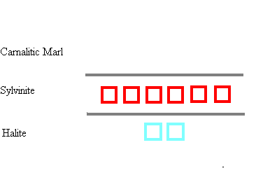 Geologists monitor the progress of each tunnel daily to ensure that they do not get too close to the overlying marl. They drill a series of 50mm x 22m bore holes every morning to test the deposits ahead. The pile of tailings from the hole is visually examined and samples are taken for testing. A "Gammatrol probe" is pushed into the hole on a long fibreglass rod and records the radioactivity from the small amounts of potassium 40 isotope, which indicates the percentage of potash in the ore. The roof must not be allowed to get thinner than 1.5 metres or it will break, allowing the Carnallitic Marl to flow into the tunnel under pressure. The geologist marks the headings for the heliminer to follow on the tunnel wall with spray paint, before leaving for the surface to enter the details on the mine's master plan.