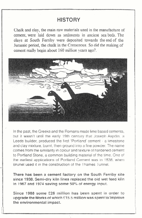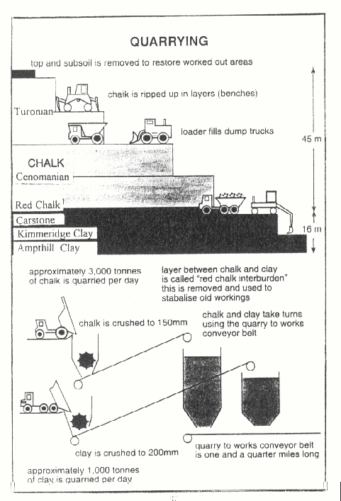 In past issues of Humberside Geologist very little has been published about how the rocks and clays we all keenly examine, describe and extract fossils from, are utilised and manufactured into a vast variety of materials and other essential everyday products. It is therefore a refreshing change to be able to publish details from a leaflet on Cement Making prepared by Petar Vjestica the Works Manager of Rugby Cement at South Ferriby in North Lincolnshire. The chalk and clays used in the manufacture of cement are extracted from their Middlegate Lane Quarry near to the main works. The following 10 figures which make up the leaflet are reproduced here, with slight modifications to Figure 3 to include some geological features.