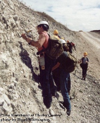 Several members lunched at the Cross Keys public house in Grasby (TA 088050) en route to the large working quarry at Mansgate Hill just south of Caistor (TA 123002), the venue for the afternoon. The party worked its way down the succeccssion from Welton Chalk beds containing the Grasby Flint (Turonian - Terbratulina lata zone) through the '‘brashy', inoceramid-debris-rich and sub-flint-bearing beds of the Mytiloides labiatus zone. The lowest beds of the Welton Chalk show a distinctive change in lithology consisting of 50cm of variegated claystone, siltstone and marl. The leader demonstrated how these beds (Turonian - Metoicoceras geslineanum zone) can be prepared to reveal several distinguishable units including the Black Band and members were occupied in searching these for fish scales and teeth. Some members were very successful. Interested readers may refer to the leader’s contribution in Humberside Geologist (1999; 12, 18-30).