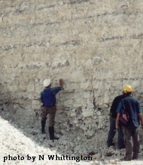 The party was not able to visit Burnham Lodge Quarry, type-section for the junction between Welton and Burnham Formations, as the landowner proved to be uncooperative. The type-section of the Deepdale Flint and Marls of the Welton Chalk (Turonian - Terebratulina lata zone) was the next stop on the itinerary (TA 045182). This is a small quarry (Deepdale Pit) owned by Singleton-Birch. The two marls were well exposed in the southern face and members were encouraged to examine the more fossiliferous, laminated chalk below the Deepdale Flint. Those used to working with more productive formations found the term ‘more fossiliferous’ amusing!