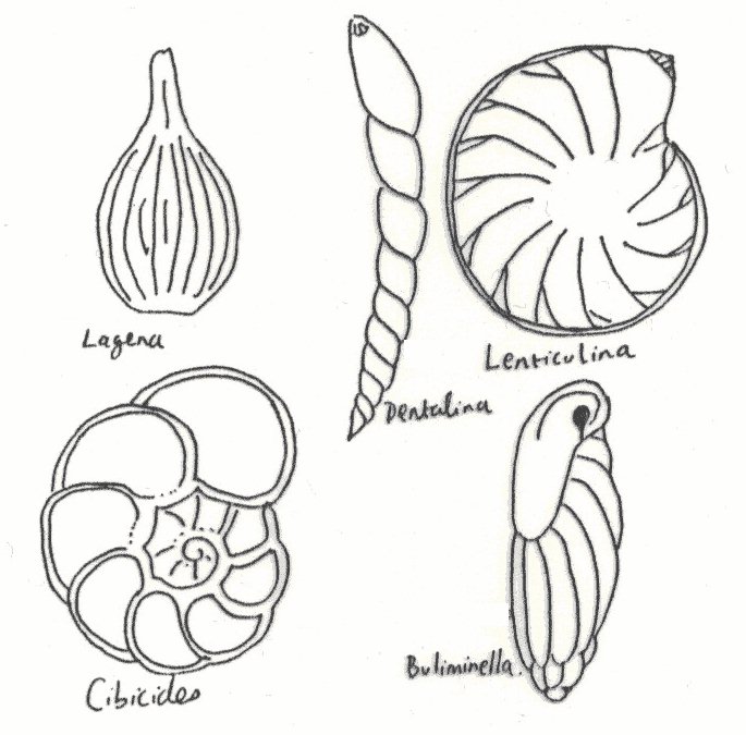 From a practical point of view, forams can be divided into four main categories: the agglutinated forms (agluts for short), the benthic calcareous forams, the planktonic calcareous forams and large benthic foraminifera.