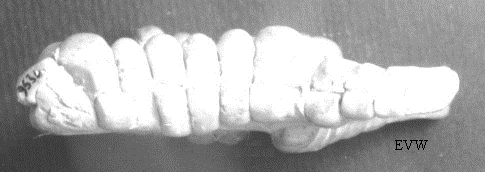The Danes Dyke - Sewerby section did, however, yield two specimens which provided an opportunity for some original work, one with dramatic results. Each was found as a jumbled mass of ossicles plainly of a single individual and we decided that a more informative "specimen" would emerge if they were separated from their matrix and reassembled in their correct places. By this time we could recognise with confidence from the articular surfaces which plate fitted next to which and into part of the arc or arm. The first attempt was made with the simple "jigsaw-puzzle" represented by a piece of Metopater uncatus of which little more than one side was present (Plate 2, no. 2); but it was useful practice. The second, similar jumble was much more extensive than the first and more difficult. It is a usual characteristic in the genus Metopaster to which this seemed to belong that the several terminal inferomarginals, up to five in number at the points of the star, are matched in the superomarginal series by single "fused" ossicles as can be seen in Plate 2, no. 2 or the side view of the M. parkinsoni in Plate 1, nos. 2b. The supero- and infero-marginalia can easily be distinguished from each other by their profiles. When we came to separate and clean the Sewerby specimen we were surprised to find that there were no "fused", terminal supero-marginals but separate, matching ossicles of decreasing size in both the upper and lower rows. We could tell from the articular surfaces how many median marginals there had been in each of the five sides. From the original jumble there eventually emerged the shape of a nearly complete starfish, not only with the "unfused" supero-marginals at the corners, but also with these appearing to be permanently upturned so that they were more than twice the height of the rest of the disc. We named the Sewerby specimen (Wright and Wright 1940) after Robert Stainforth who had found a fragmentary, articulated example which supported our reconstruction. At the time we placed the new species in Metopaster; but a few years after, Brunnich Nielsen (1943) described a new genus, Recurvaster, for later Danish specimens also with the characteristic upturned arms and our species should be referred to that genus of which much fine material is now known from the Continent (Rasmussen 1950; Schulz & Weitschat 1975), again fully confirming the soundness of our reconstruction of the Sewerby specimen (Plate 2, no. 3 a & 3 b).